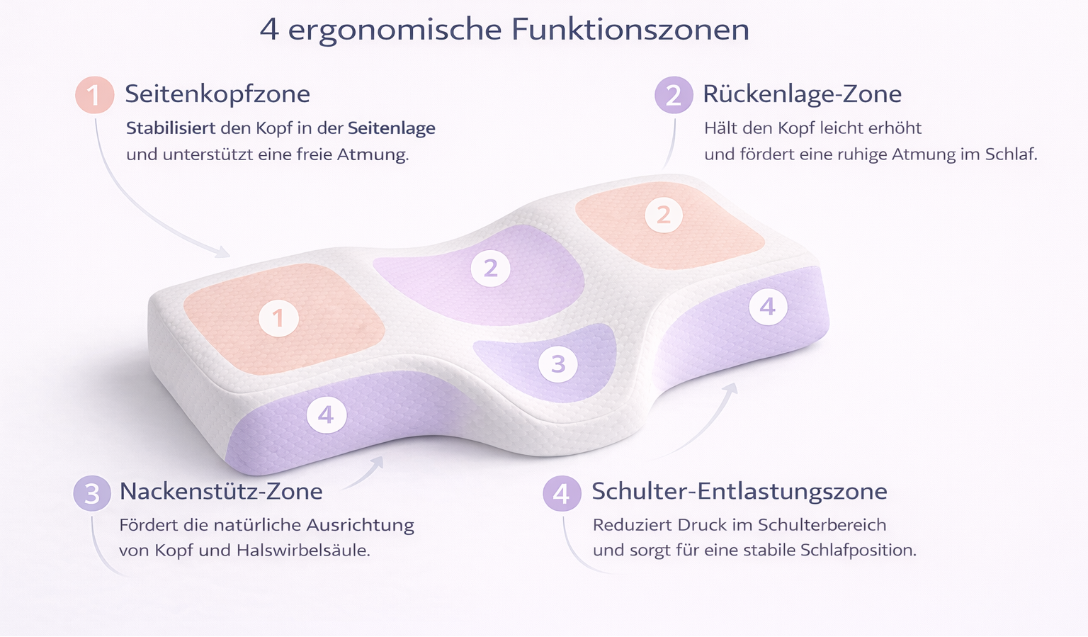 Das durchdachte 4-Zonen-Design stabilisiert Kopf und Nacken in jeder Schlafposition. Ob Seiten- oder Rückenlage – das Kissen unterstützt eine ergonomische Ausrichtung und kann eine ruhige Atmung begünstigen.